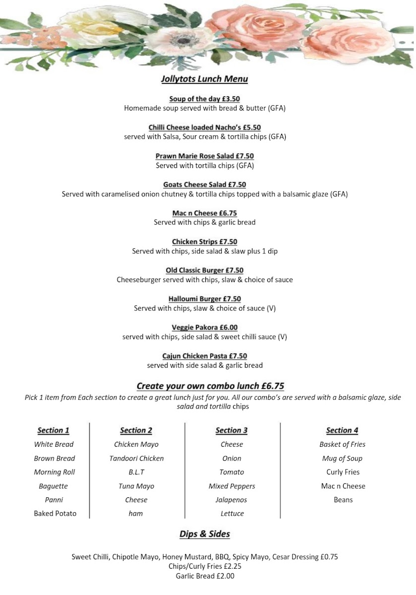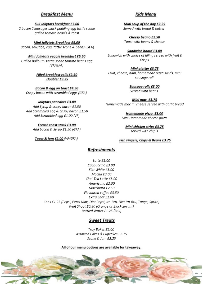Introducing the menu at Jollytots And Cookies, a delightful play café located in Uddingston, Glasgow, where culinary delights meet a vibrant play area for kids. As you step inside, you're greeted by a warm and inviting atmosphere, ideal for families. The café features a well-curated menu that appeals to both adults and children, offering great value in combo deals.